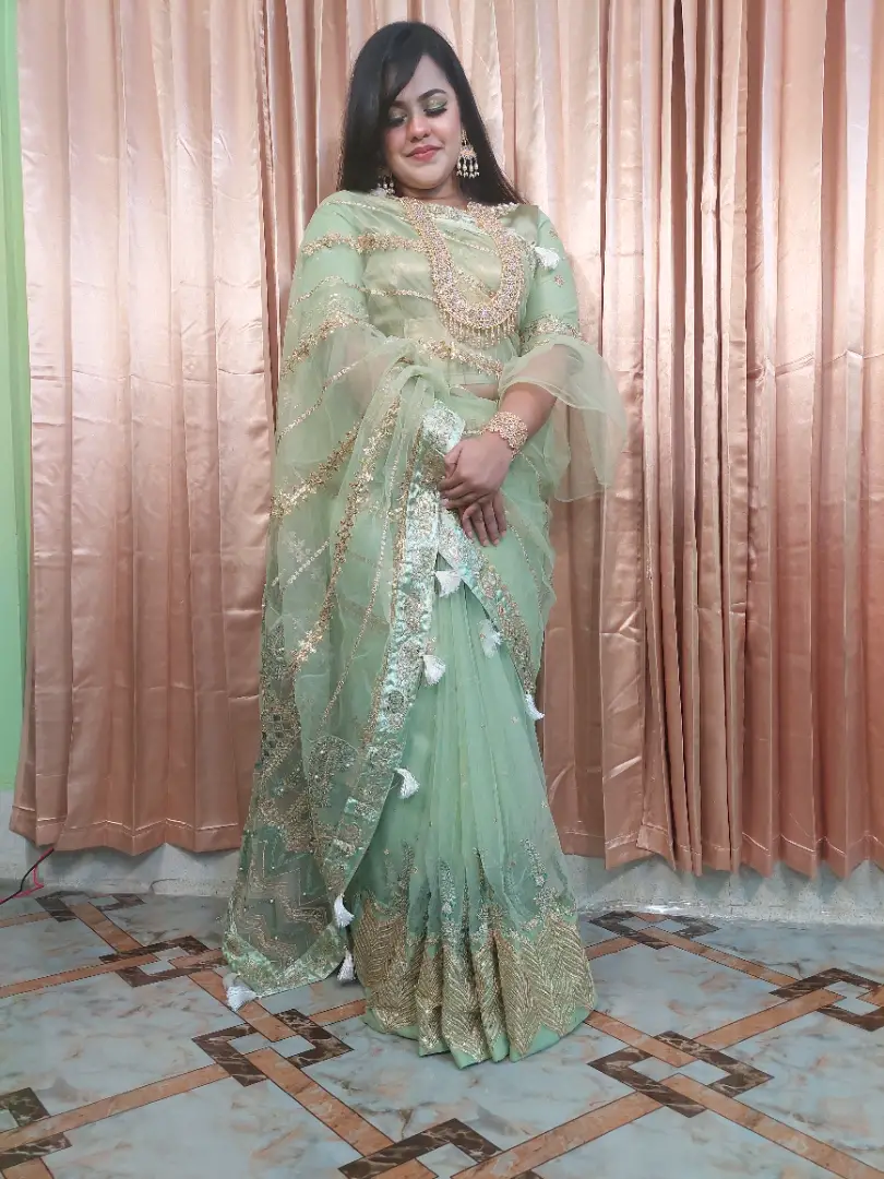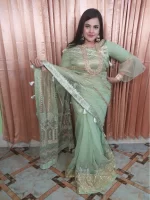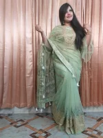 আঁচল কাটয়ারক করা আছে। কুচিতে জমাট বাধা সিকুয়েন্স এর কাজ আছে, । ব্লাউজ পিস এর জন্য আছে দুবাই সিমার ক্রেপ silk উপরে আছে হ্যান্ড ওয়ার্ক করা ক্রিস্টাল, এডি স্টোন, জারদৌসি