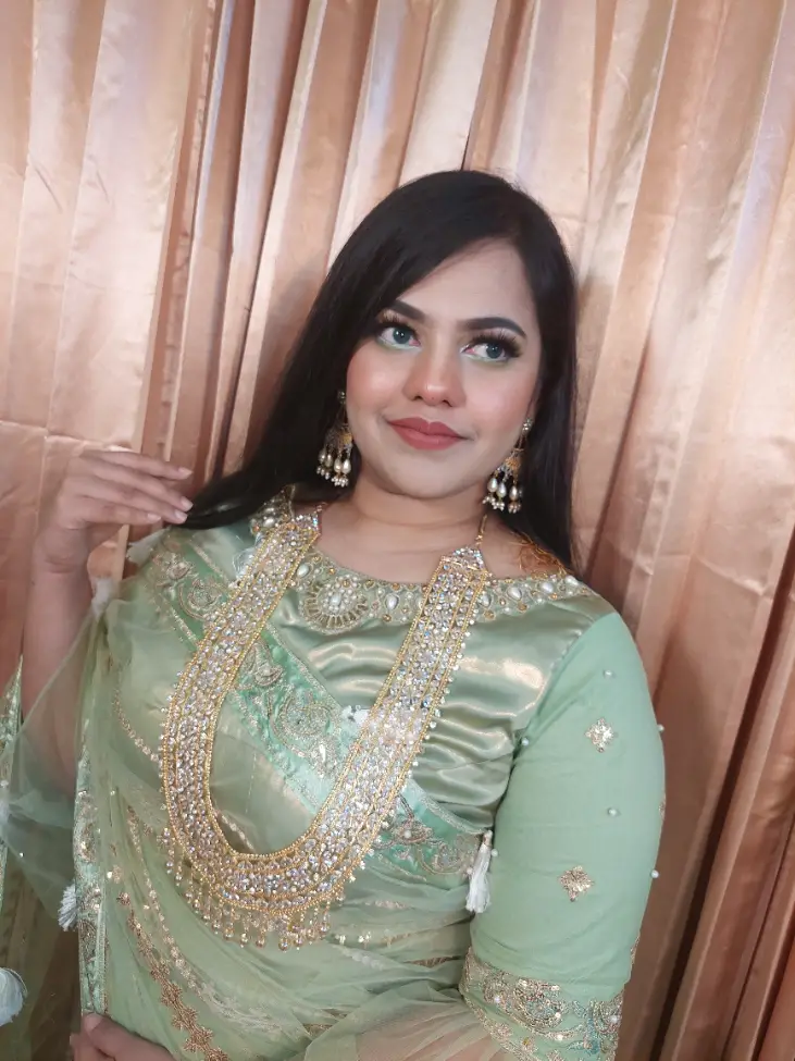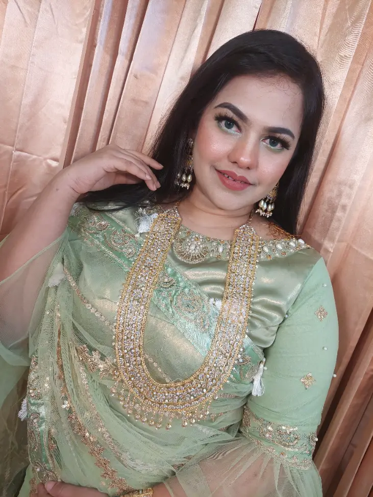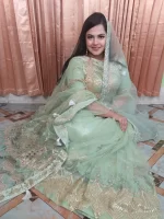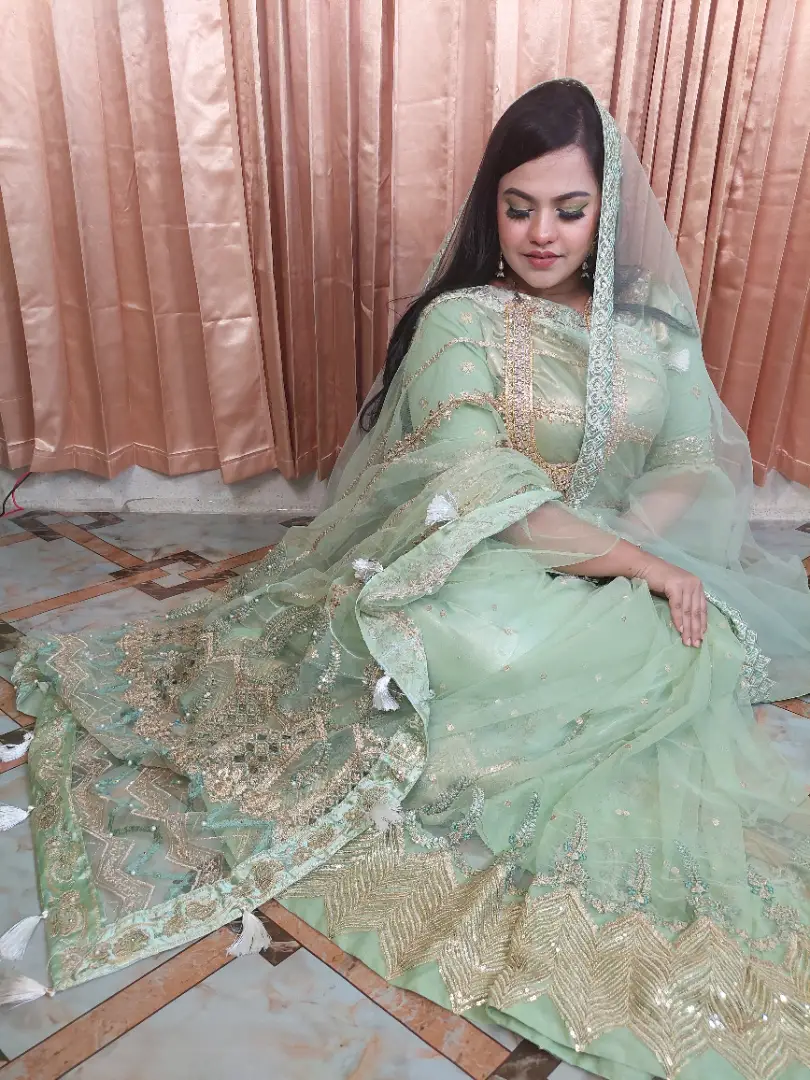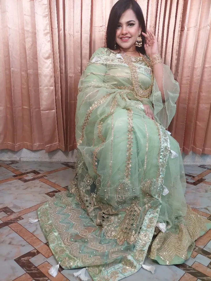 📌শাড়িঃ অরিজিনাল ম্যাক্র নেটের উপরে এম্ব্রইডারি, সিকুয়েন্স, ক্রিস্টাল স্টোন ওয়ার্ক করা আছে। সম্পূর্ণ শাড়িতে জারদৌসি এবং পার্ল এম্বলিশড করা, ফুল শাড়িতে রেশাম টারসেল লাগানো।