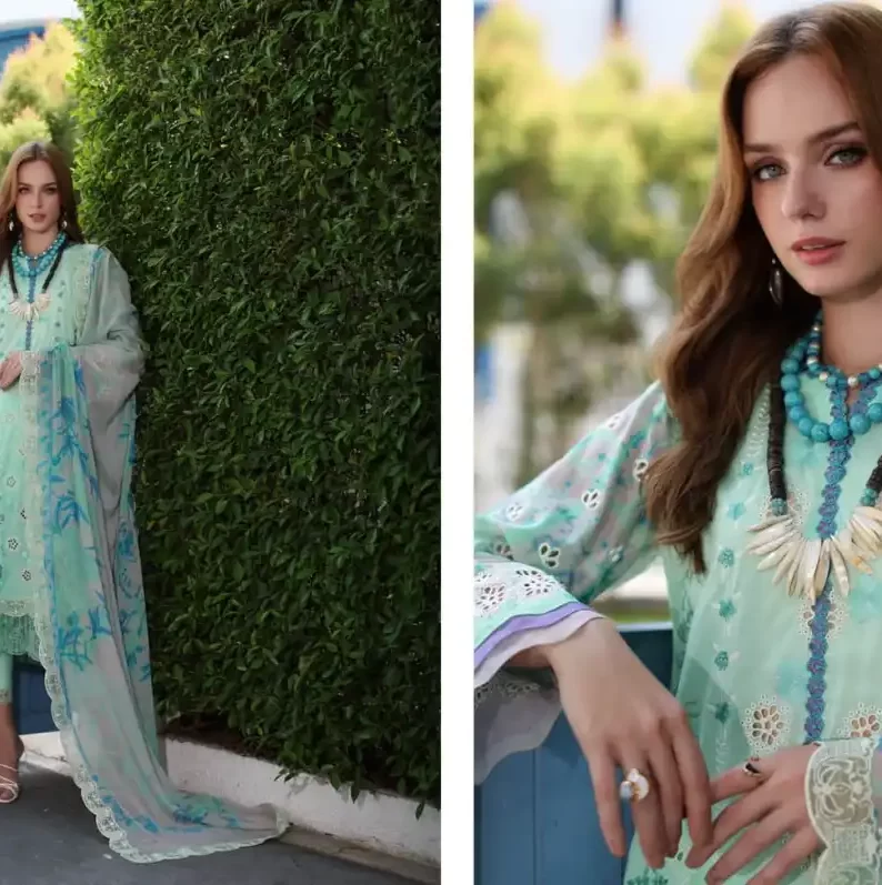 Dress: All over heavy embroidery, cutwork, lace work on pure luxury Lawn