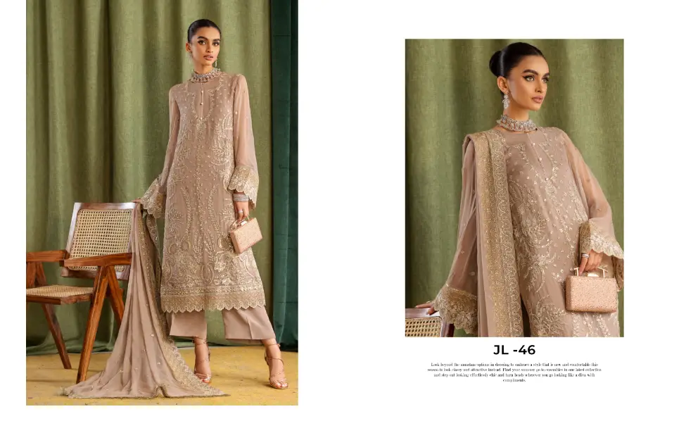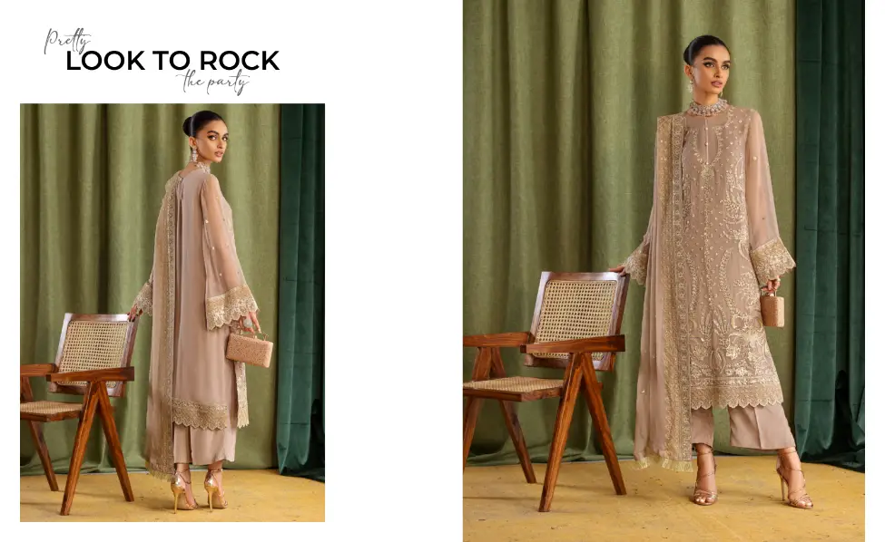 Dress: All over heavy embroidery, sequence Luxury weightless bamber chiffon